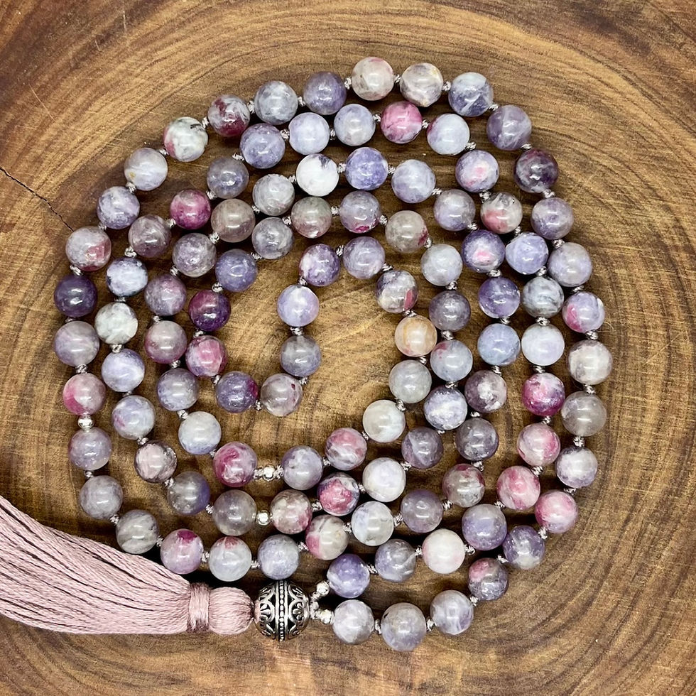 Passion + Self-worth MALA is hand knotted on durable nylon, wine thread. It features silver plated round Guru bead and spacer beads, and a handmade 100% cotton wine tassel.